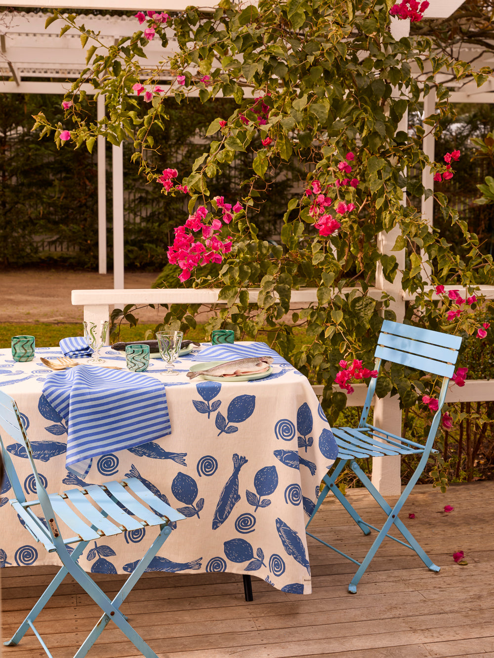 Bringing together sardines, lemons and coastal motifs, our Sardines Blue Tablecloth is inspired by playful decor found in coastal tavernas across the Mediterranean.