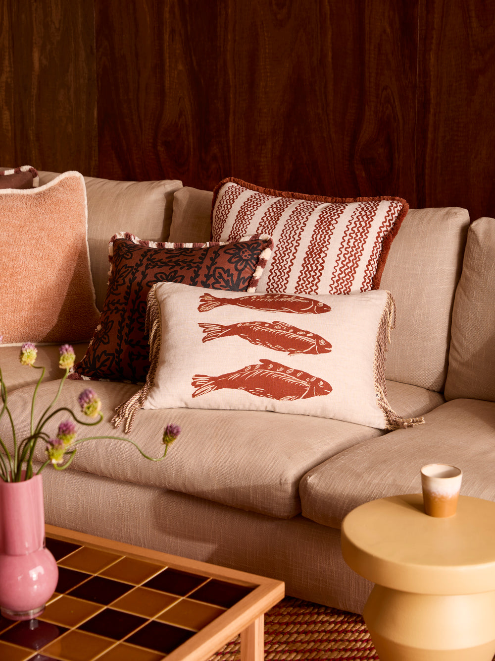 A linen cushion decorated with hand-drawn sardines in tan brown, finished with soft fringing. Perfect for relaxed, coastal interiors with a touch of colour and texture.