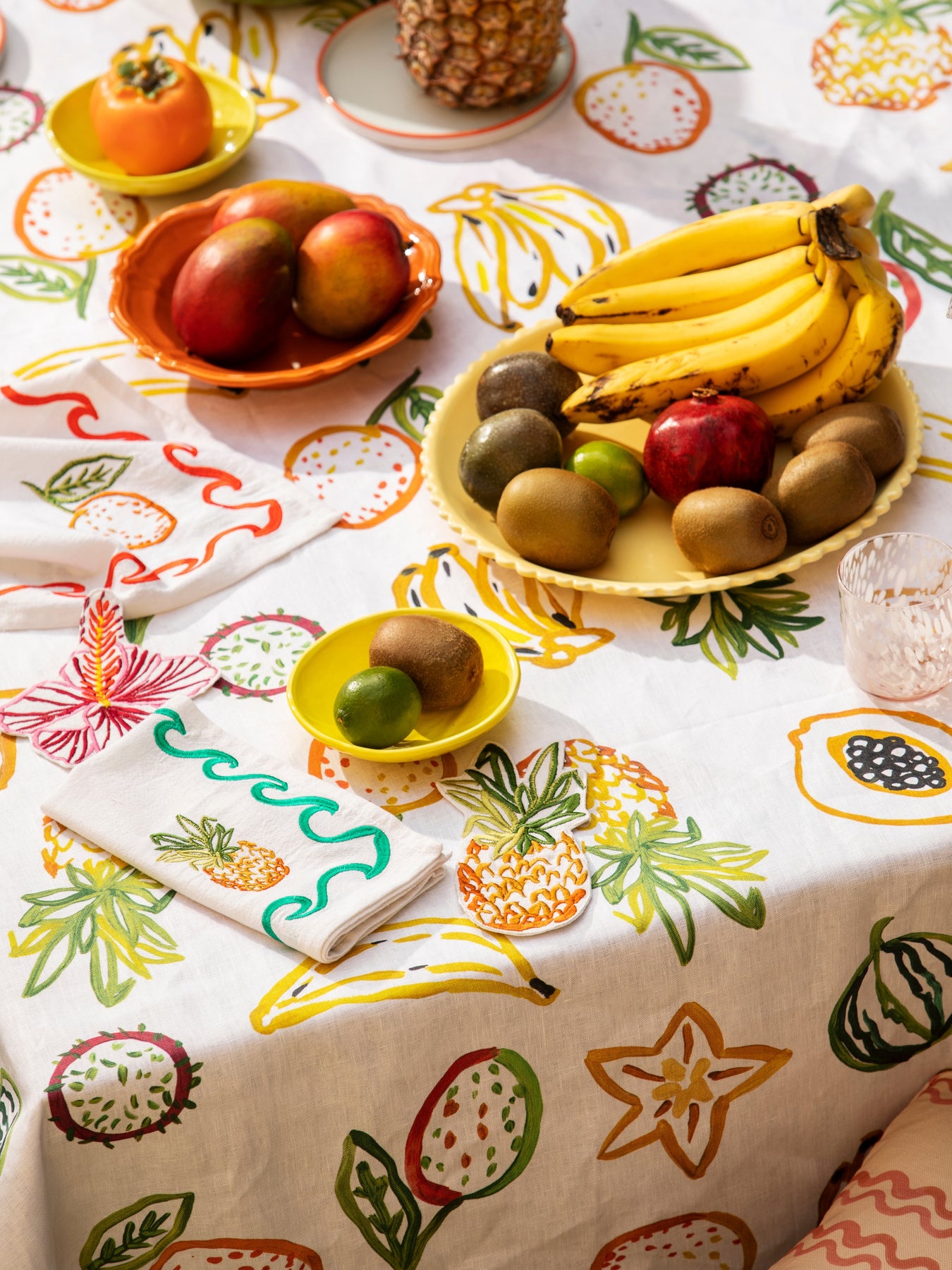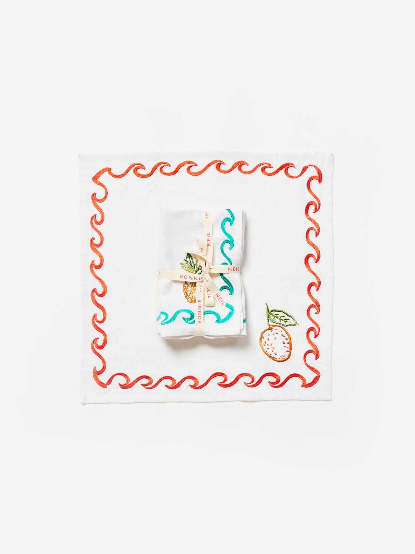 Our Mixed Surf embroidered linen napkins feature delicately embroidered tropical fruit and coastal motif borders in bright summer colours. Comes in a set of 6 napkins.