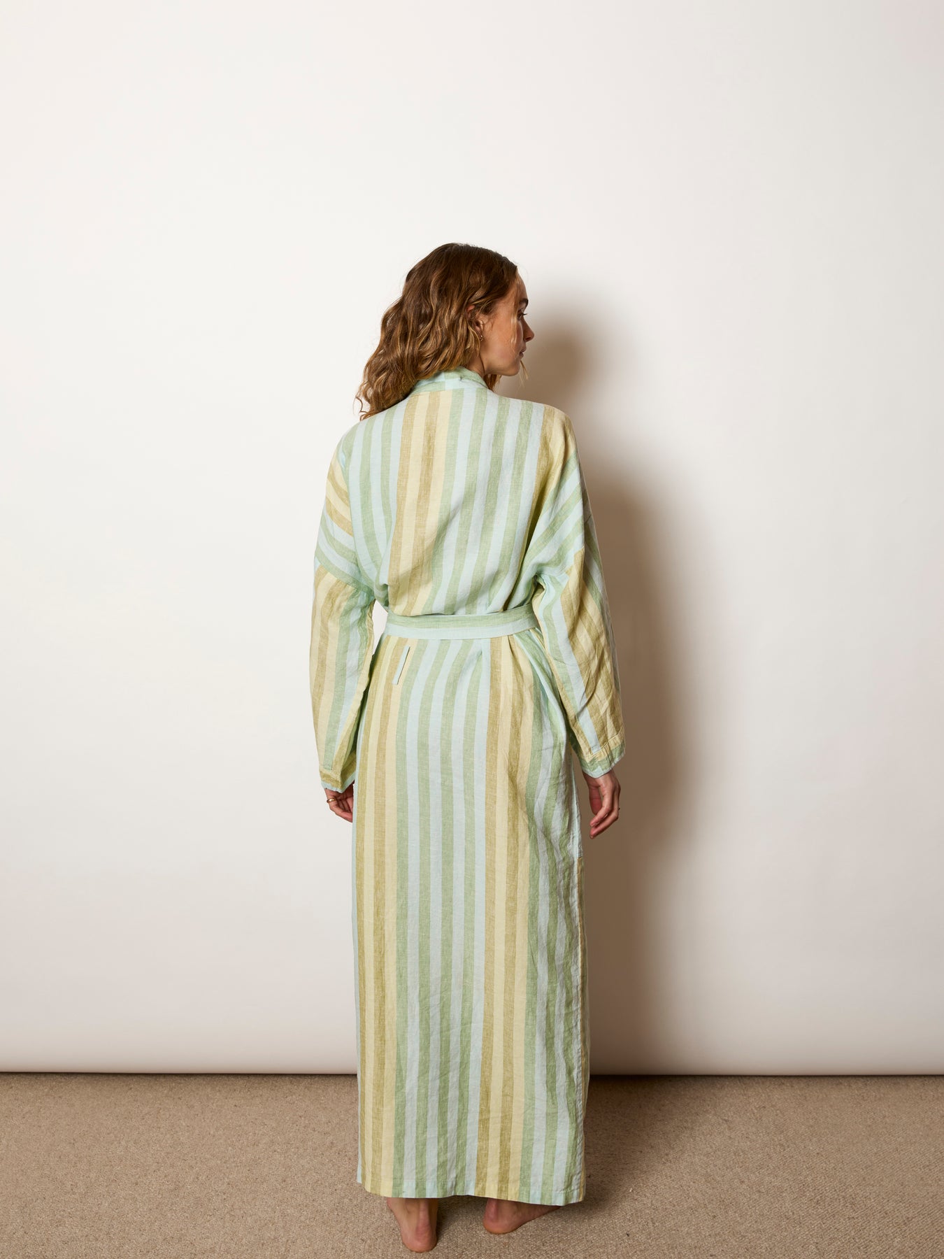 Relaxed linen robe in blue and green stripes, designed for easy layering. Lightweight and breathable, it's perfect for bringing a fresh coastal feel to your morning routine.