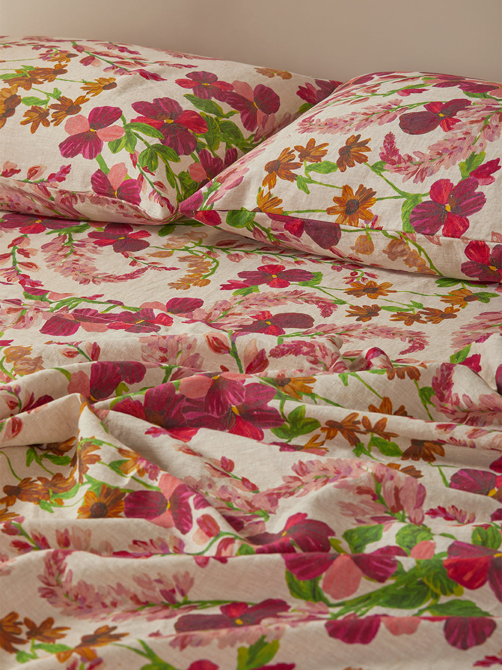 Our Lupin Multi Linen Standard Pillowcases bring a hand-drawn botanical print right where you rest your head. Stonewashed 100% French flax linen gives them that effortless, relaxed softness that makes them a favourite in any linen bedding set.