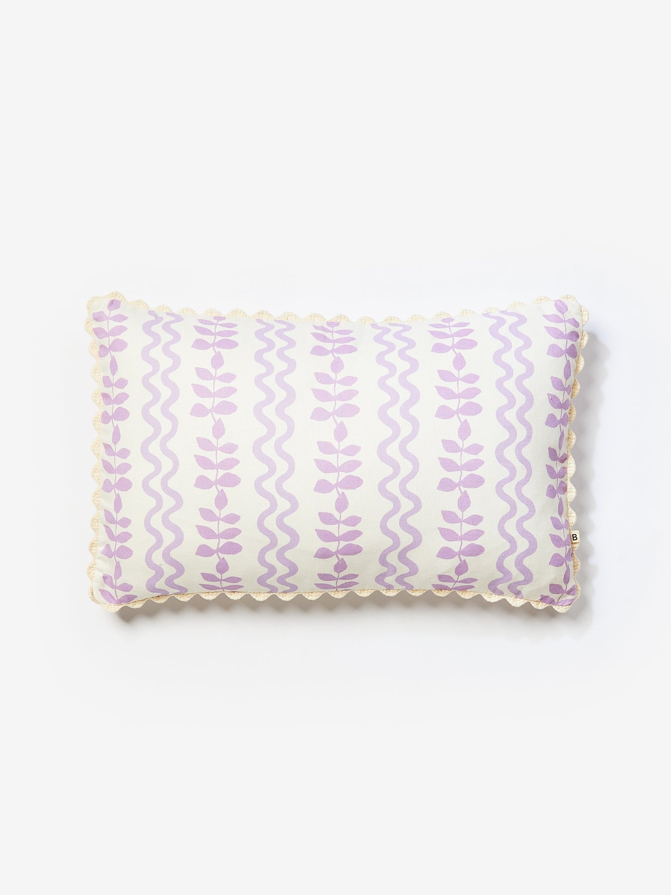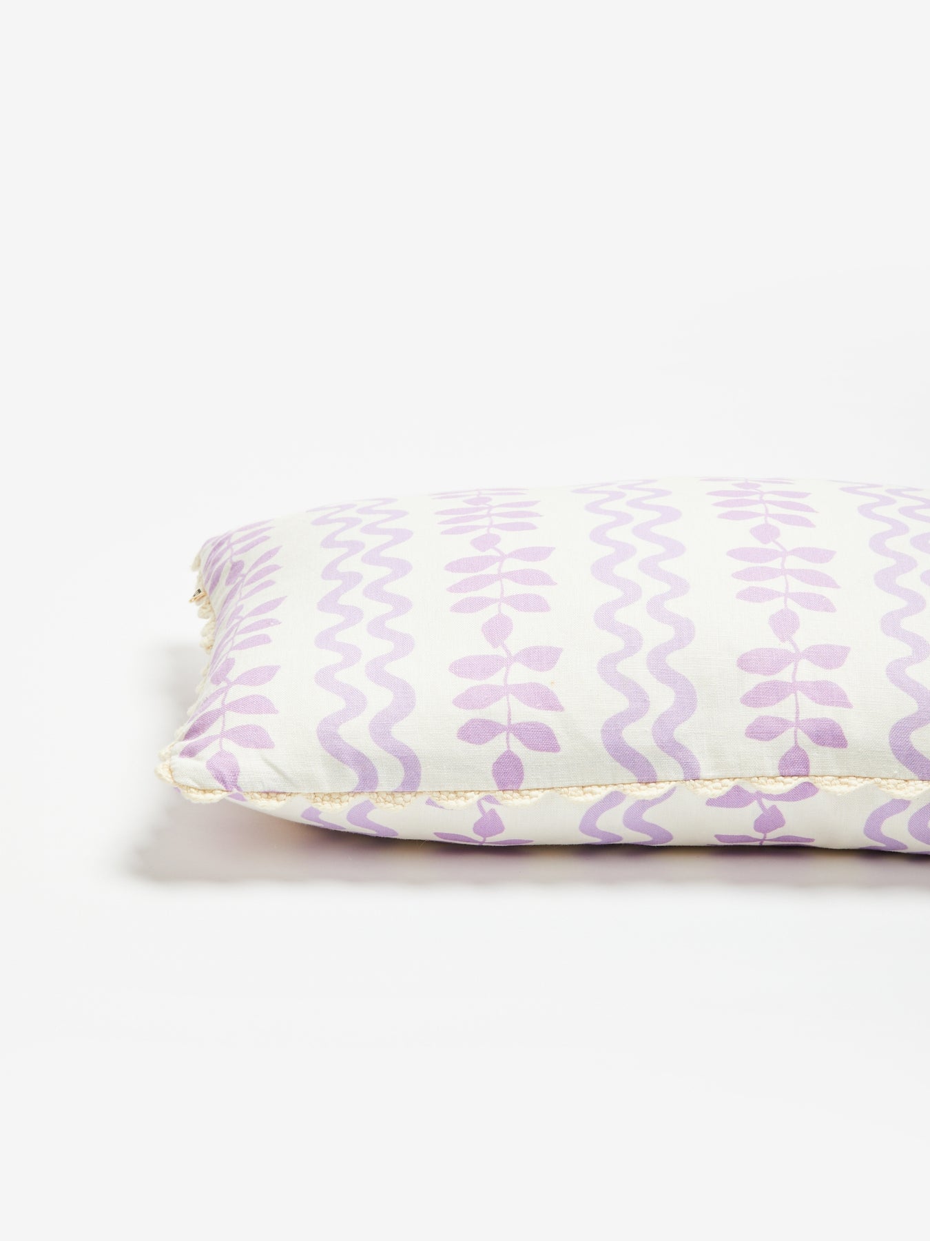 Our Ferns and Waves Lilac 60x40cm cushion features original artwork by Bonnie printed on white linen. The reverse of the cushion features the same design.