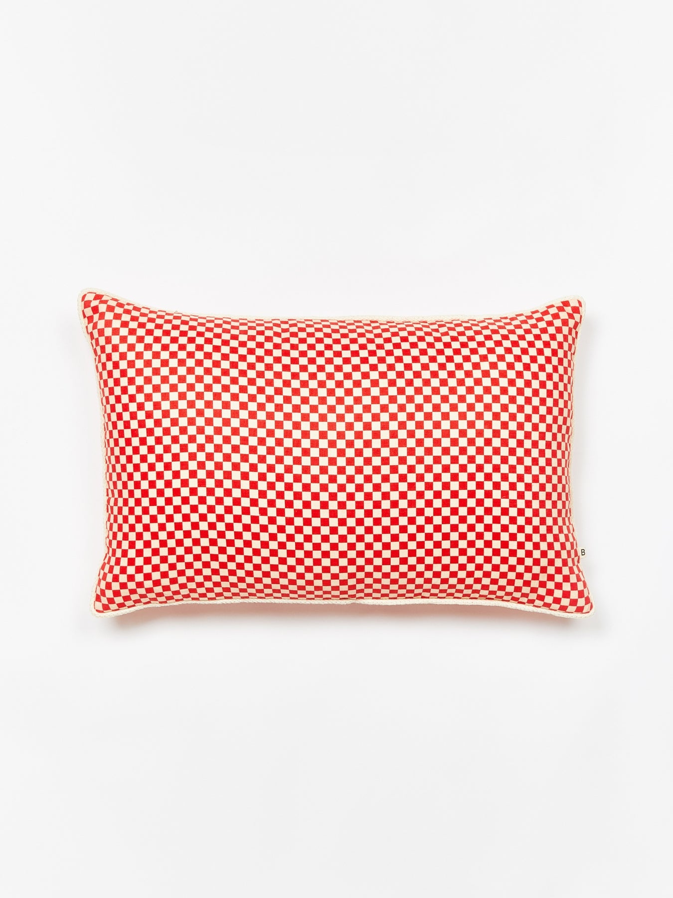 Our Tiny Checkers Red Peach 60 x 40cm cushion features original artwork by Bonnie printed on white linen. The reverse of the cushion features the same design.