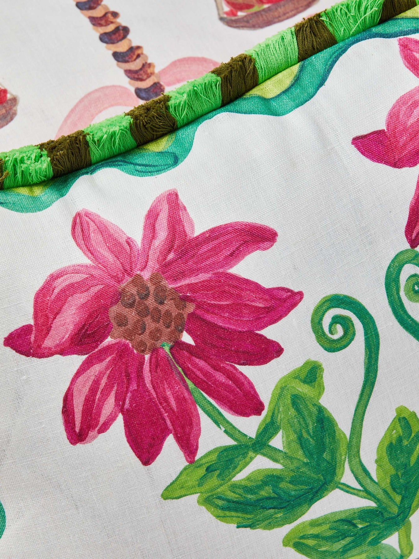 • Finished with a chocolate brown and mint green striped cotton fringe trim