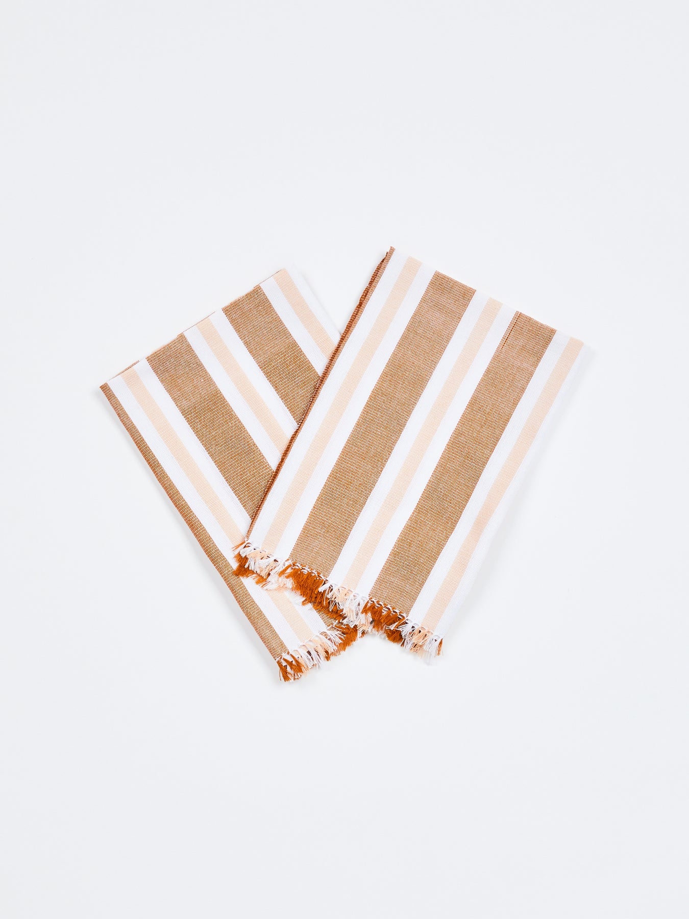 Our Woven Stripe Tan Peach napkins are made from soft woven cotton.