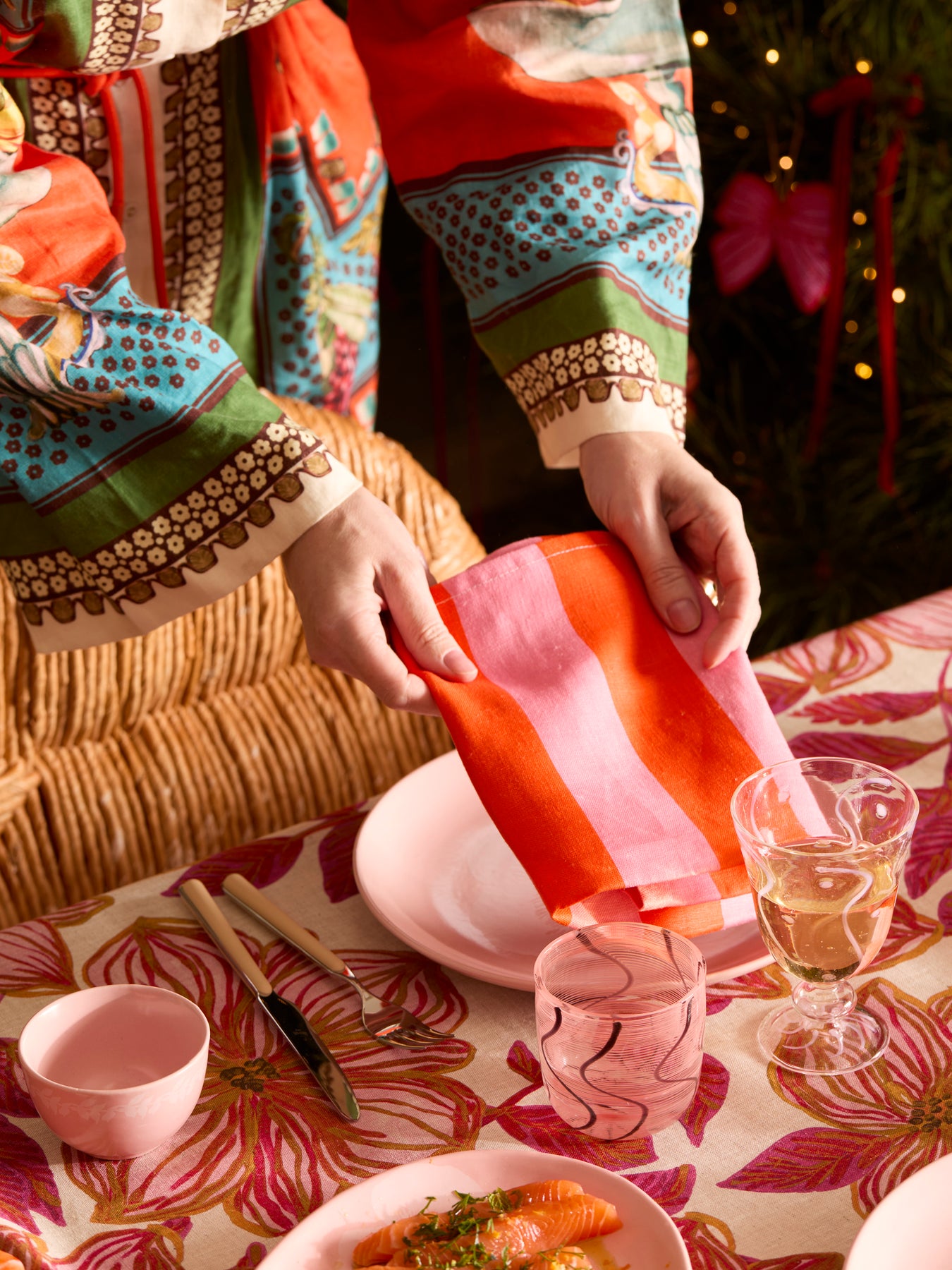 Retro stripes in sorbet pink and orange add a playful twist to summer or everyday table settings.