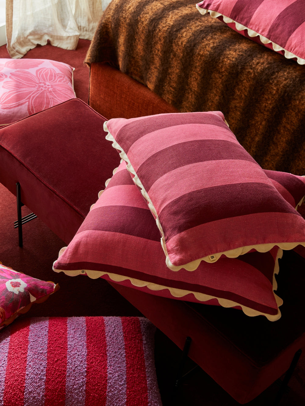 Vibrant and full of personality, our Big Stripe Cerise Cushion is a bold celebration of colour. Inspired by retro deck chairs and sun-kissed adventures, its lively pink stripes bring energy and joy into any setting. Perfect for your statement sofa or an indoor corners in need of colour, this cushion pairs beautifully with vibrant florals and soft boucle stripes.