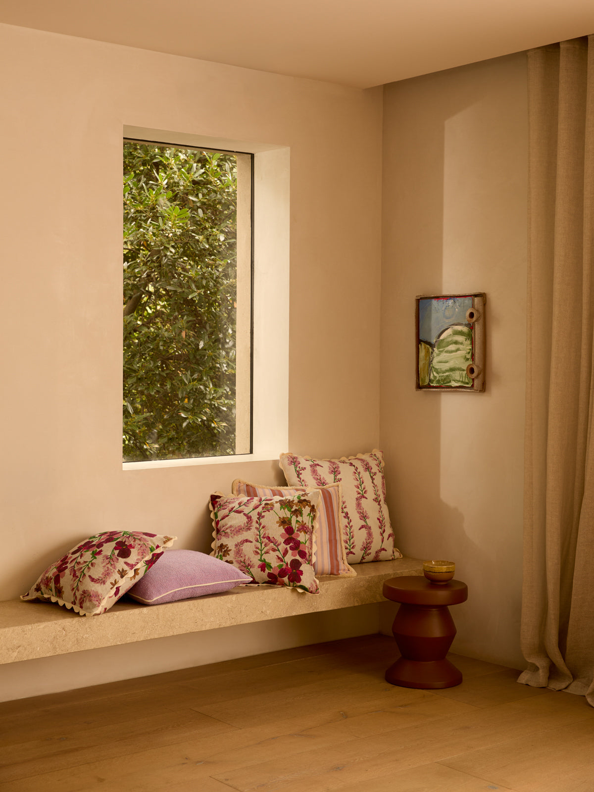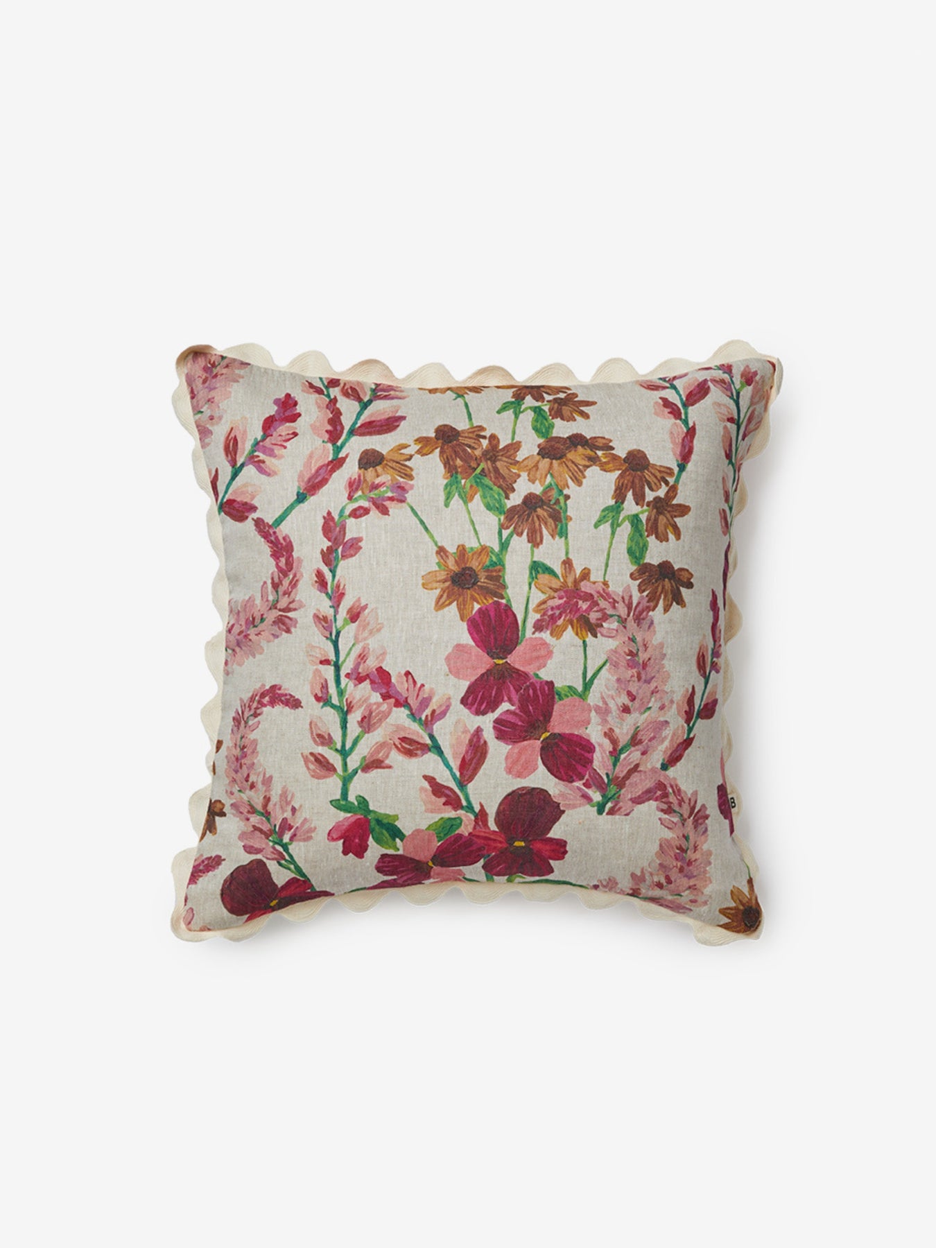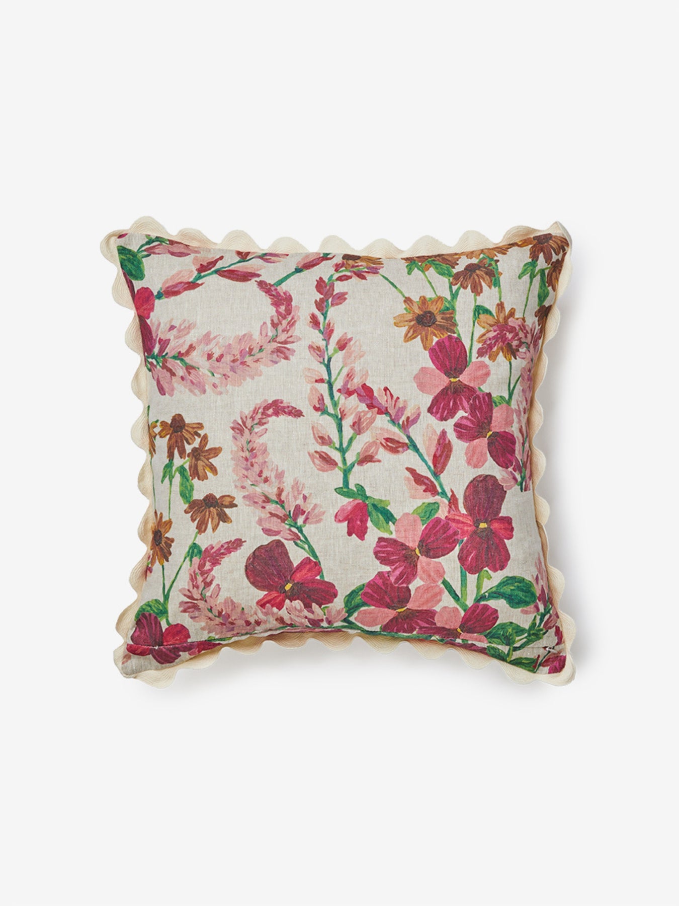 Painterly pink florals scatter across this oat linen cushion, inspired by wild lupins in New Zealand’s South Island. Expressive and vibrant, it brings a sense of landscape indoors.