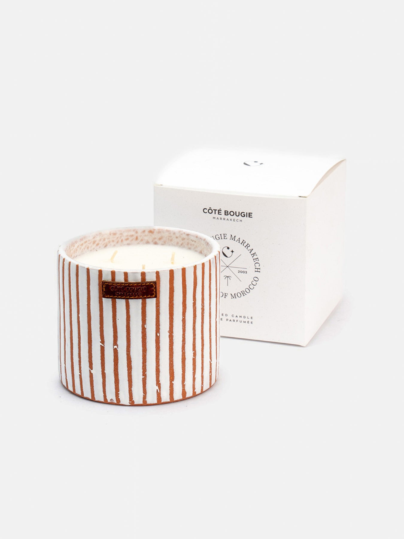Bold in design and rich in fragrance, the Zebra Terra candle from Côté Bougie is housed in a hand-thrown, hand-painted ceramic jar made in Marrakech. A pure white base with striking terracotta stripes, meaning each piece is uniquely its own. A design-led celebration of authentic Moroccan craftsmanship and contemporary style.