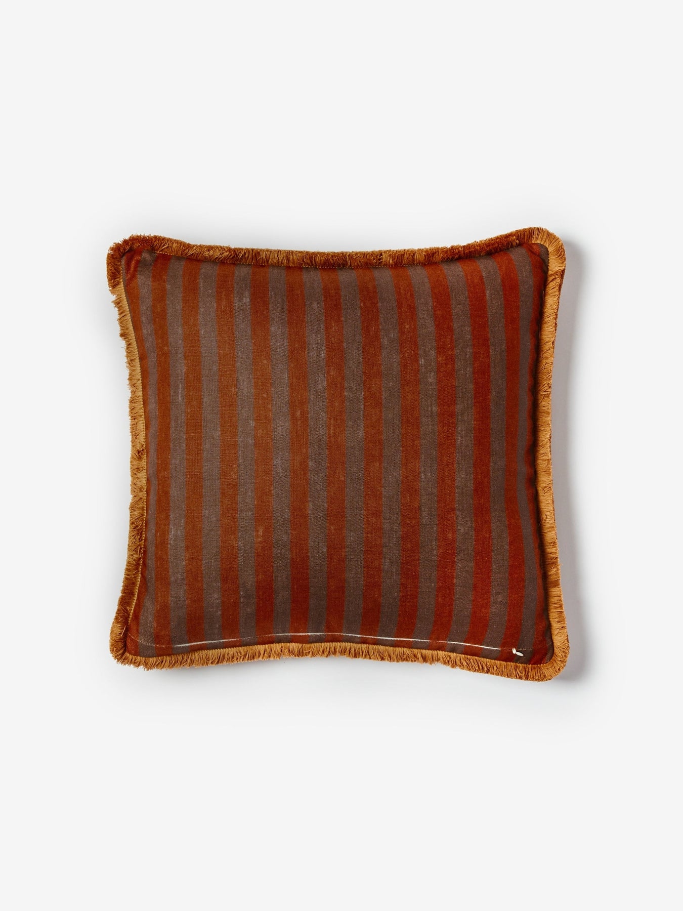 Taking inspiration from interior textiles and wall hangings found in seventies interiors, our Thin Stripe Chocolate Cushion brings warmth and richness to your living space. The ideal companion for vibrant patterns or textured fabrics, this brown striped cushion is the perfect addition to the cushion selection for your lounge room.