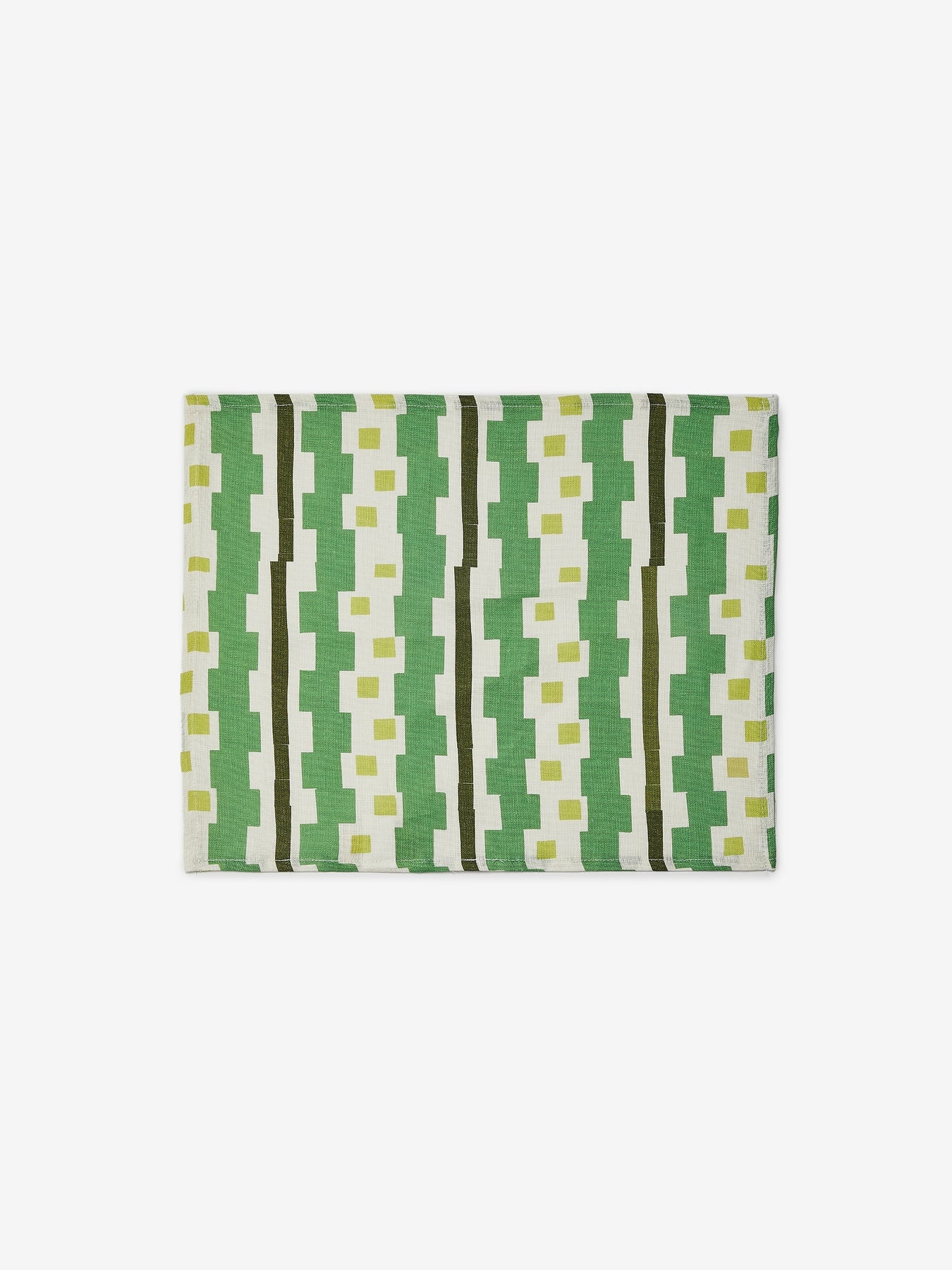 Green geometric patterning runs across these linen place mats, bringing bold structure to the table or bench top.